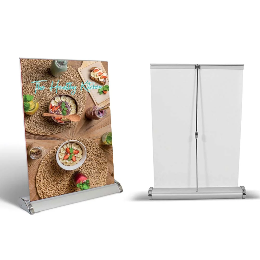 Table Top Roll-Up banners are a compact and effective branding solution for reception desks, counters, trade show booths, and more. These small-size roll-ups are printed using the same high-quality digital printing technology as our full-size versions, ensuring your logo, message, or promotional offer appears crisp and eye-catching even at a smaller scale.